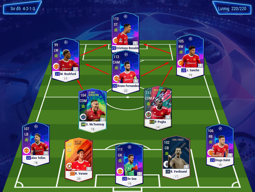 Sơ đồ được lựa chọn là 4213 với những cái tên đến từ mùa giải 21UCL. Riêng trường hợp Pogba, do mùa 21UCL của anh có chỉ số và chất lượng sử dụng quá thấp nên buộc phải dùng mùa giải cao cấp hơn là BTB.