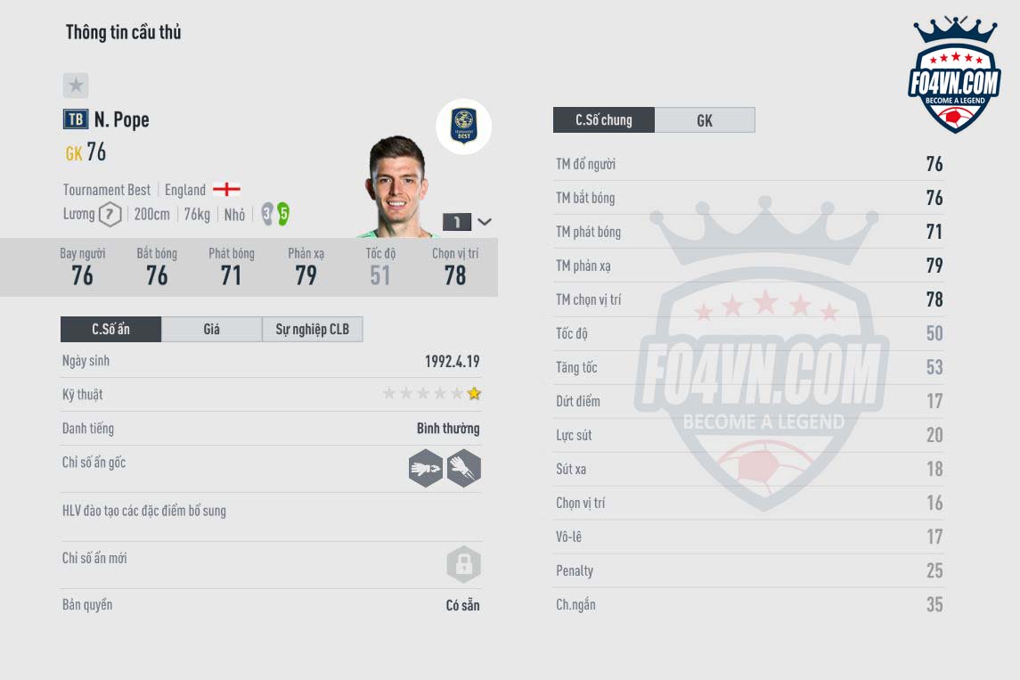 Không phải Courtois. Pope mới là cái tên được chọn mặt gửi vàng của các HLV trên top. Lương rẻ, bắt ảo là những yếu tố tiên quyết cho vị trí thủ thành, thêm vào đó có vẻ như các HLV chuộng thủ môn có đấm bóng trong chế độ GLXH này. Pope TB có đầy đủ mọi yếu tố đó.