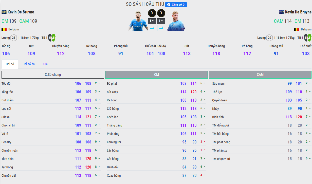 Nhiều người thích đá Kevin De Bruyne ở vai trò một tiền vệ trung tâm, nên chúng tôi sẽ xét đến tiêu chí này. Như các bạn thấy là trên thẻ 23TY ưu tiên vị trí CAM trước, còn 22TS là vị trí CM. Tuy vậy thì cả hai mùa đều đá CM gần như ngang nhau, bất chấp mùa 23TY có chỉ số cao hơn nhiều. Từ các khâu cắt bóng, kèm người, hay tranh chấp.