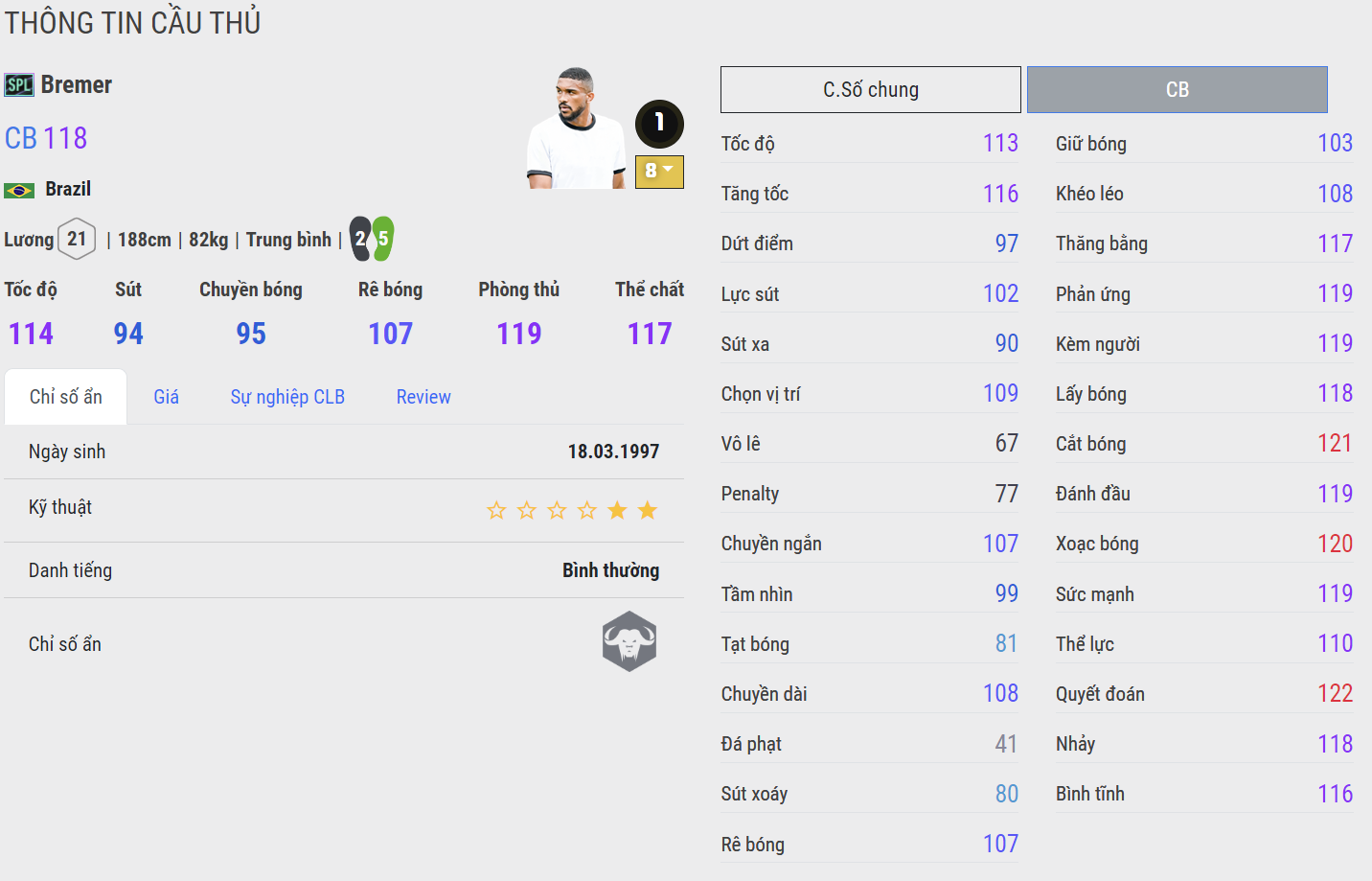 Trung vệ thép mà team color Juventus cũng như Brazil cần có. Anh sở hữu tốc độ tốt, thể hình to cao, khả năng phòng ngự và tranh chấp rất tốt cùng bộ kỹ năng không chiến ấn tượng. Cầu thủ người Brazil được đánh giá rất cao về giá trị sử dụng và đang là tâm điểm của đội hình.